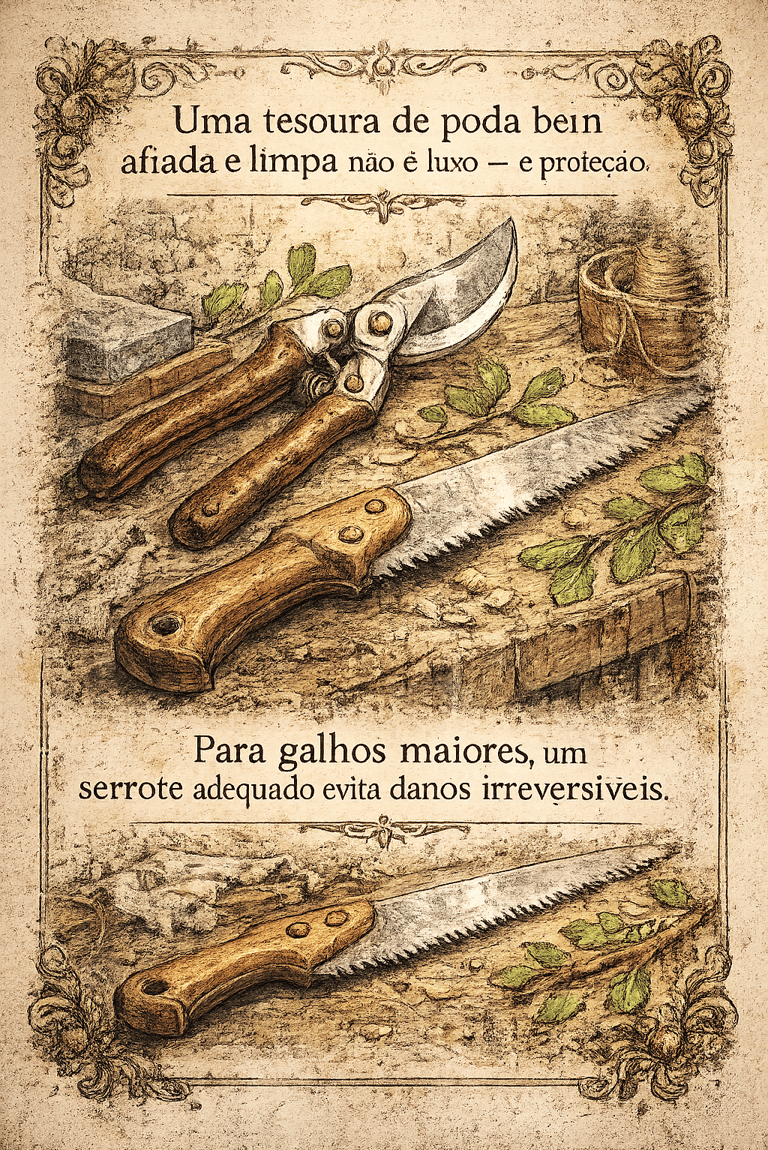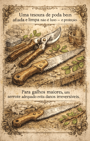 👉 Para galhos maiores, um serrote adequado evita danos irreversíveis.